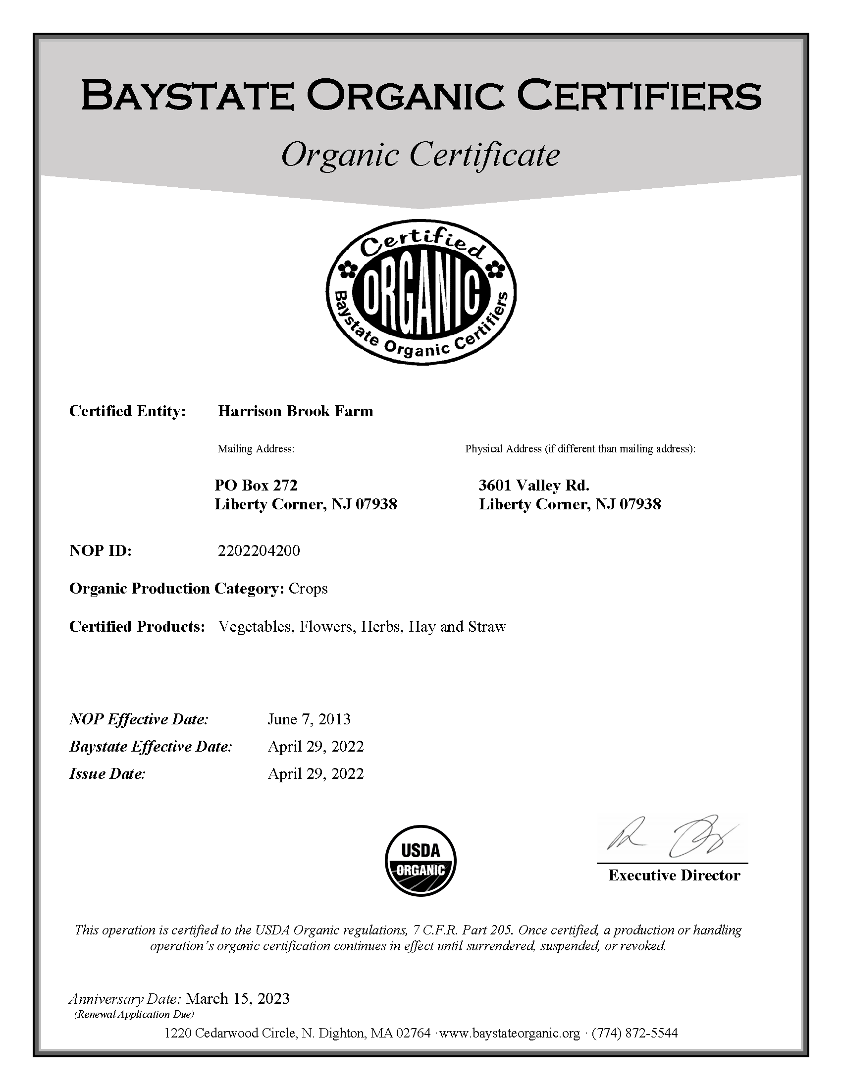 We obtained our original organic certification from the certifying agent representing the USDA in 2013 on our very first attempt. The certification process though, is not a single time application event. Each year we must submit an update and undergo an on-site audit by an independent auditor from which the certifying agent makes a decision on certification status. In 2022 our original certifying agent withdrew from the USDA NOP so we have moved to another certifying agent. We continue to meet all the requirements and successfully maintain our 100% certification for vegetables, herbs, flowers, straw and hay.